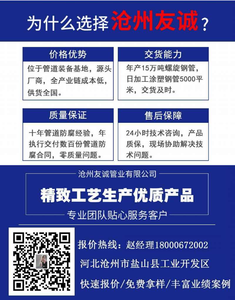涂塑螺旋鋼管 給水涂塑鋼管適用于-30℃-120℃的工作環(huán)境,與其他金屬管、塑料管、復(fù)合管相比,它綜合了各種管道的特點(diǎn),既有鋼管的強(qiáng)度,又有塑料管的耐腐蝕、耐磨損,流體阻力小等特點(diǎn),是一種安全衛(wèi)生強(qiáng)度高,粘結(jié)強(qiáng)度好的綠色管道。友誠牌涂塑鋼管廣泛用于高層建筑給排水,外鍍鋅內(nèi)涂塑鋼管價(jià)格,消防噴淋,暖通、電纜內(nèi)外防腐、天然氣、冷熱循環(huán)水管道的耐熱防腐、海水循環(huán)系統(tǒng)、工業(yè)系統(tǒng)、循環(huán)水系統(tǒng)、去離子純凈水系統(tǒng)、耐磨防腐系統(tǒng)、防結(jié)垢抗菌防腐系統(tǒng)、內(nèi)外防腐系統(tǒng)、電纜護(hù)套、消防噴淋系統(tǒng),保溫防腐系統(tǒng),化工重防腐系統(tǒng)等.消防用涂塑鋼管管道是屬于強(qiáng)制檢驗(yàn)制度的消防產(chǎn)品。法蘭涂環(huán)氧樹脂鋼管占據(jù)著重要的作用,所以內(nèi)外涂環(huán)氧樹脂鋼管的質(zhì)量更好,內(nèi)外涂環(huán)氧樹脂樣品(4張)是掌握著消防系統(tǒng)的關(guān)鍵,所以下面我們來介紹內(nèi)外涂環(huán)氧樹脂鋼管的生產(chǎn)工藝,其粉末(環(huán)氧樹脂)的性能,以及內(nèi)外涂環(huán)氧樹脂鋼管的產(chǎn)品性能。它是國家指定的消防用管同時(shí)也是綜合性價(jià)比*的環(huán)保綠色管道,被廣泛用在消防噴淋給水領(lǐng)域。